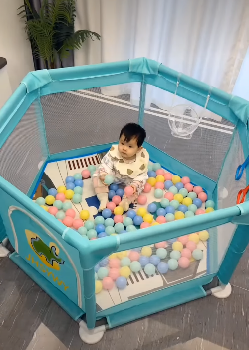 The image shows a baby sitting inside a light blue hexagonal playpen filled with colorful plastic balls. The baby is wearing a patterned outfit and appears to be playing happily. The playpen is placed indoors on a tiled floor, with soft curtains and home décor visible in the background, creating a cozy and safe play area for a child.