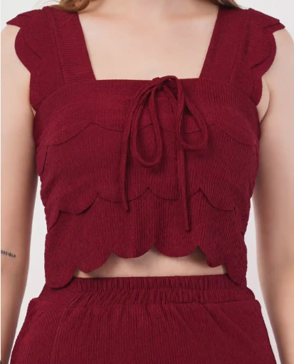 This chic maroon crop top features a square neckline with broad shoulder straps and charming scalloped edges that add a feminine flair. The layered scallop design creates a unique texture, while the front tie-up detail enhances the playful and trendy look. Made from a soft, stretchable ribbed fabric, it offers both comfort and style — perfect for pairing with high-waisted skirts, pants, or co-ords for casual outings or brunch dates.