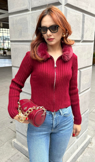 Make a statement with this charming two-piece outfit featuring a rich red knit cardigan designed with a luxurious faux fur collar for a cozy yet elegant look. The cardigan is paired with a complementary green skirt, creating a striking color contrast that feels both classic and stylish. Perfect for cooler seasons, this set is ideal for casual outings, festive gatherings, or smart everyday wear. Soft, warm, and effortlessly chic, it’s a must-have addition to any wardrobe.