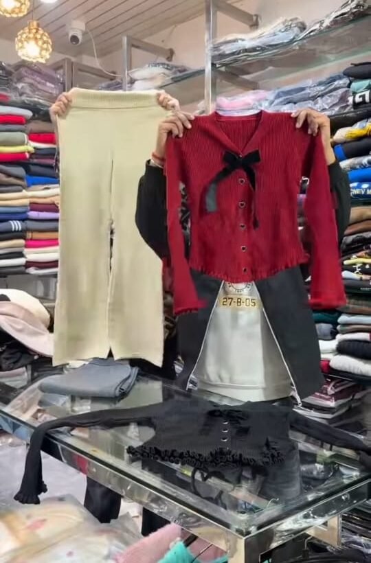 The image shows a person standing behind a glass counter in a clothing store, holding up a red long-sleeve top with a black bow detail and a pair of beige pants. The background shelves are filled with neatly folded clothes in various colors, indicating a retail fashion shop environment.