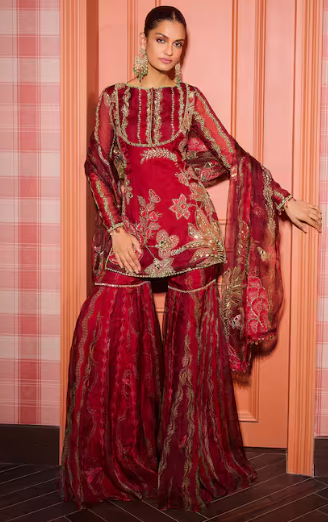 This stunning maroon sharara set exudes timeless elegance with its rich embroidery and luxurious detailing. The kurta features intricate gold and threadwork motifs, beautifully balanced with a structured neckline and flowing sleeves. Paired with a voluminous sharara adorned with coordinated patterns, the ensemble creates a regal silhouette. A matching dupatta with ornate borders completes the look, making it perfect for weddings, festive celebrations, and formal occasions where grace and sophistication are key.