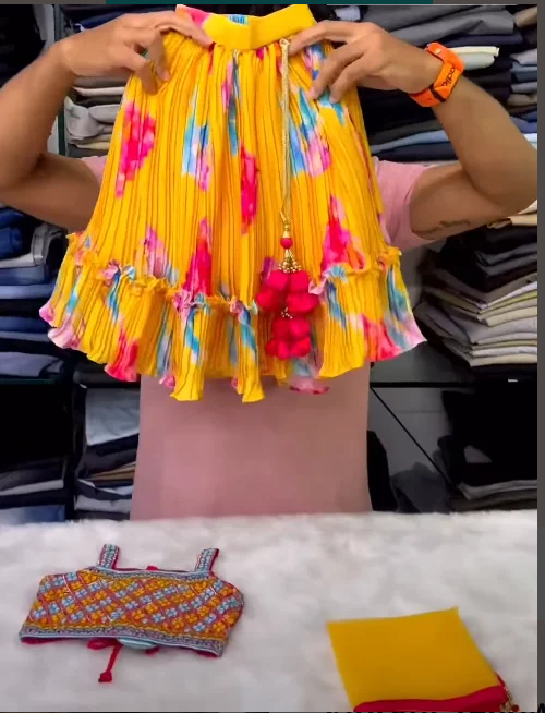 This eye-catching girls’ frock features a bright yellow base adorned with colorful floral prints, perfect for festive and casual occasions. The dress includes playful pom-pom tassels at the front and a stylish frilled hem, adding charm and volume. Made from soft, lightweight fabric, it ensures comfort while giving your little one a cheerful, fashionable look.
